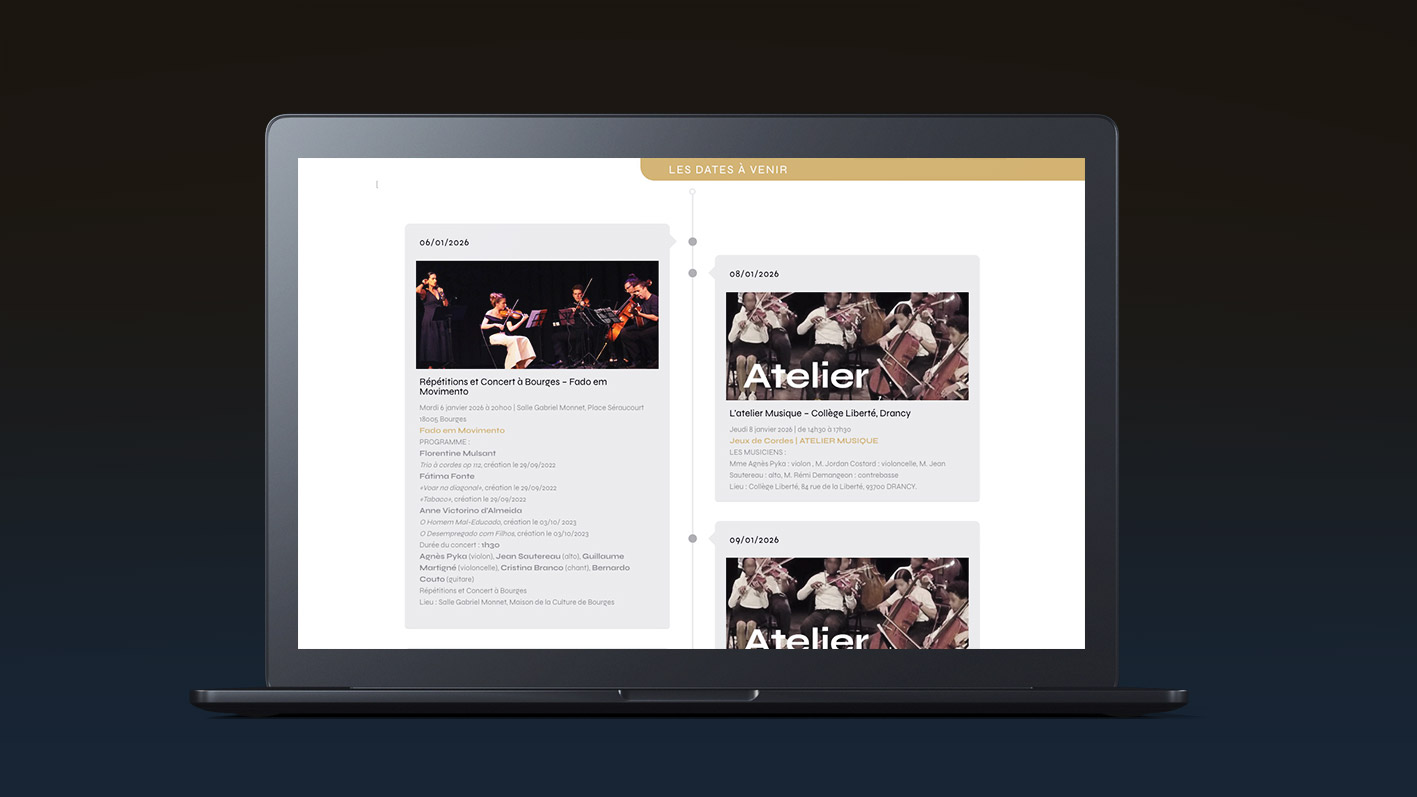 Création du site internet. Création des éléments de communication (dossiers spectacle, de diffusion, de mécénat, bilan annuel…).