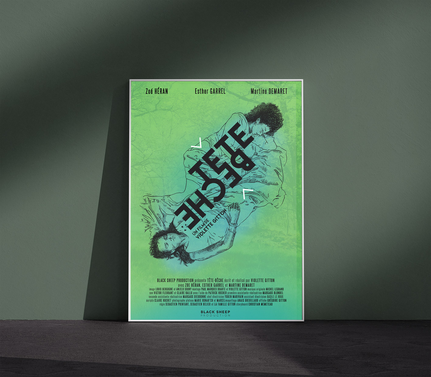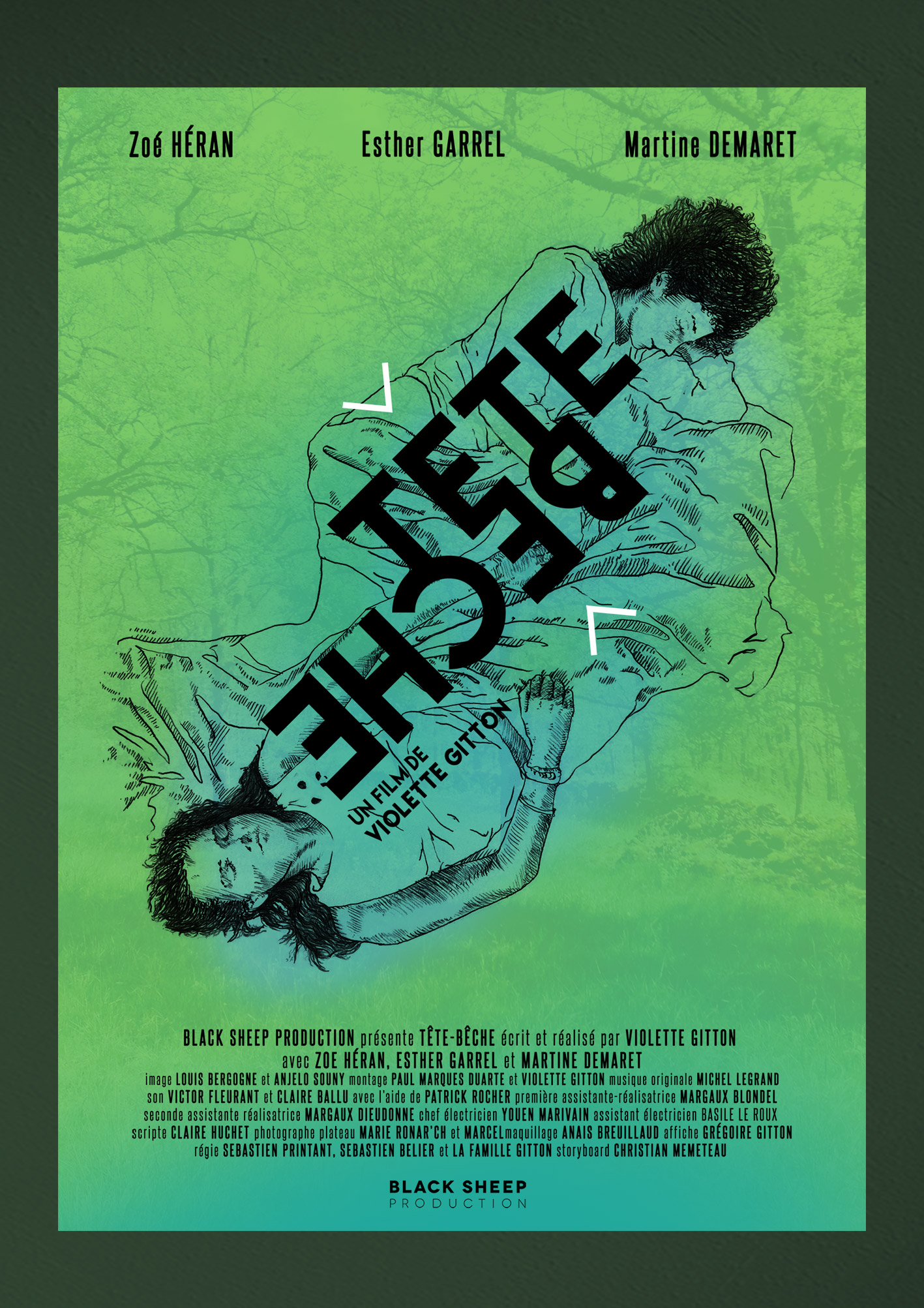 ← GRÉGOIRE GITTON | DESIGN GRAPHIQUE VIOLETTE GITTON | TÊTE BÊCHE Tête Bêche est un film de la réalisatrice Violette Gitton (Ce qui appartient à César, Malheur niveau 2,…), avec Zoé Héran, Esther Garrel et Martine Demaret. Création de l’affiche du film :Graphisme, illustration